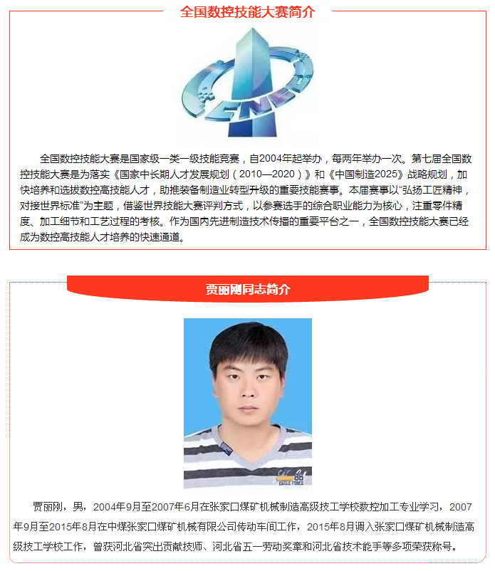 11月6日至15日,“2016年中國技能大賽——第七屆全國數(shù)控技能大賽”在北京市舉行,張家口煤礦機械制造高級技工學(xué)校賈麗剛同志代表河北省參加數(shù)控車職工組項目比賽,經(jīng)過激烈角逐,最后取得該項目全國第14名的佳績。