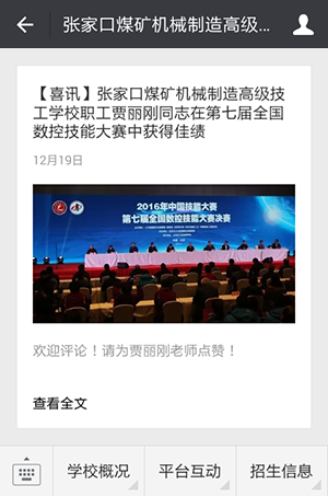 張家口煤礦機械制造高級技工學校微信公眾平臺的運行界面 張家口煤礦機械制造高級技工學校微信公眾平臺“zjkmjjx”通過了運營商的資質審核認證,使得該平臺的多項功能得以開通,從而為學校增添了一種形式新穎、溝通方便的創新的宣傳渠道。 微信公眾平臺作為一種新型媒體工具,旨在為用戶及時提供信息和資訊。公眾平臺可以定期向訂閱用戶發送一條(組)群發消息,利用這一功能,張家口煤礦機械制造高級技工學校定期向訂閱用戶遴選、推送學校及與學校教育相關的重大時事、最新政策等信息,幫助用戶深入了解學校、及時掌握中職教育行業新動向。 利用微信公眾平臺的菜單功能,張家口煤礦機械制造高級技工學校將學校網站的數據與微信公眾平臺實行無縫對接,將網站內最重要的內容同時在微信界面呈現。同時在平臺底部開通"學校概況"、"平臺互動"、"招生信息"等欄目,使得訂閱用戶能夠利用手機、平板等移動上網設備,便捷地享受學校提供的服務。 張家口煤礦機械制造高級技工學校還將進一步挖掘、開發微信公眾平臺的功能,使得這一宣傳渠道在學校工作和發展中發揮更加積極的作用。