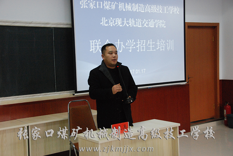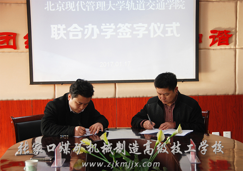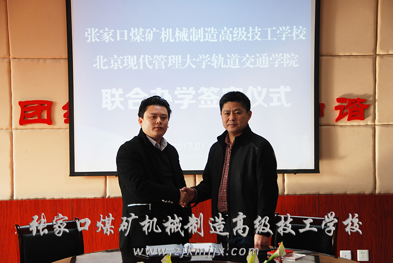 2017年1月17日上午,經過前期的考察洽談,張家口煤礦機械制造高級技工學校與北京現代管理大學軌道交通學院舉行了校校合作簽字儀式。學校郎效雷副校長與軌道交通學院胡延震院長代表雙方學校簽署了合作協議。雙方聯合開辦高鐵服務類、高鐵技術類、銀行金融類和電廠類等專業,采取定向委托培養方式,實行“2+1”模式,共同培養行業需求的實用性技能人才。