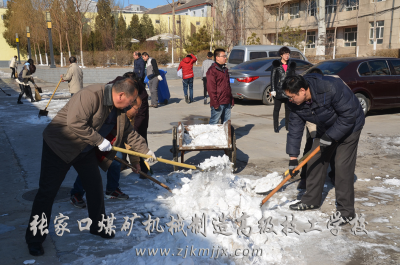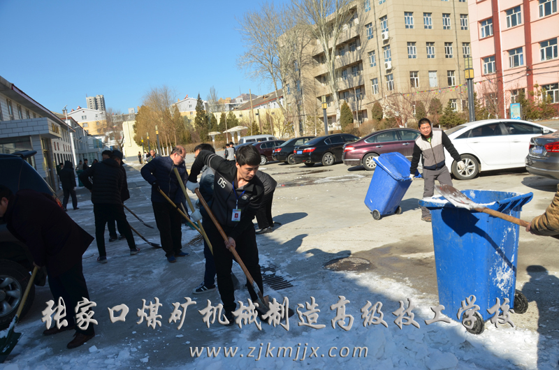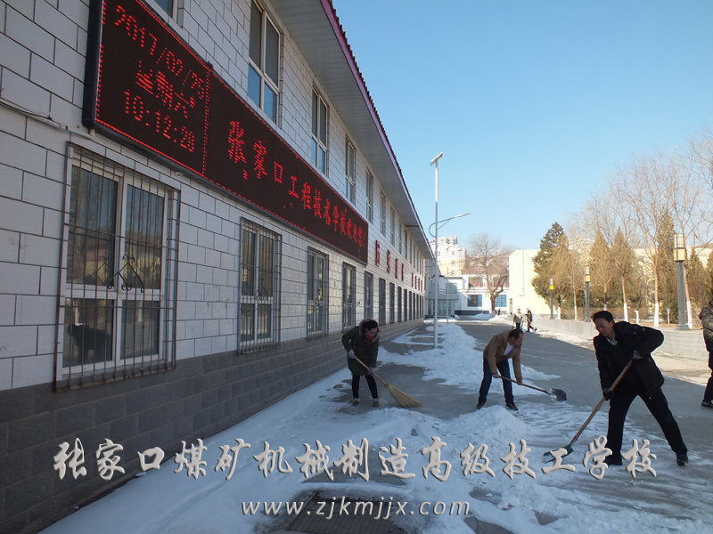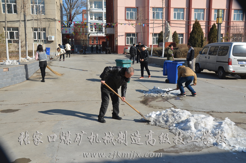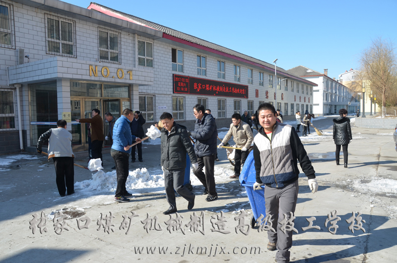 2017年2月25日,張家口煤礦機械制造高級技工學校2016—2017學年第二學期開學第一天,學校黨委組織全體黨員義務勞動,鏟除、清掃覆蓋校園的積雪。