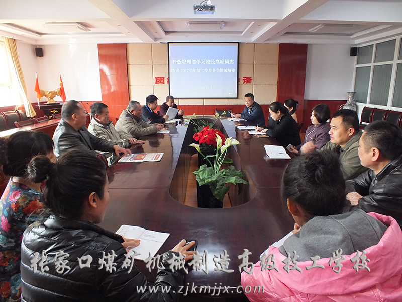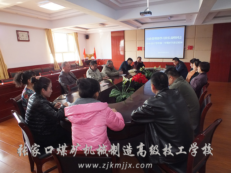 為更好地完成新學期工作,2017年3月21日,張家口煤礦機械制造高級技工學校行政管理部組織本部全體人員,學習2016-2017學年第二學期高峰校長的開學講話《深化改革 開拓進取 持續發展》。張樹偉副校長參加會議,行政管理部部長馬保衛同志主持會議。