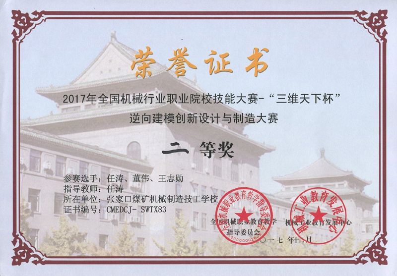 學(xué)校在2017年全國(guó)機(jī)械行業(yè)職業(yè)院校技能大賽“三維天下杯”逆向建模創(chuàng)新設(shè)計(jì)與制造大賽中喜獲佳績(jī)