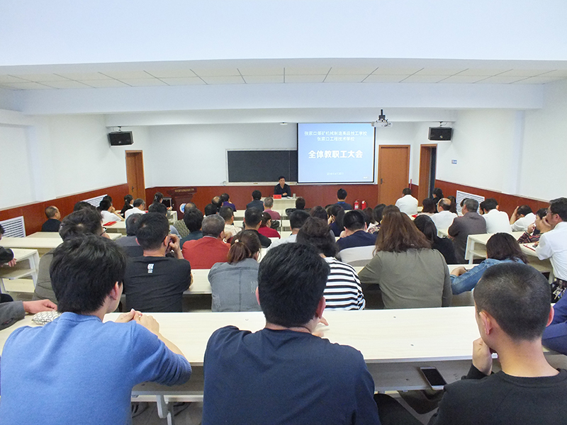 2018年4月20日下午,張家口煤礦機械制造高級技工學校在綜合樓階梯教室召開了全體教職工大會。會議由黨委委員、副校長張樹偉同志主持。 本次會議的主要內容是宣布學校任命、聘用中層干部和臨時負責人的決定。這也是本學期學校根據發展需要,進行機構調整后,對部分崗位中層管理人員實施公開競聘,對聘期已滿原有中層管理人員實施續聘或轉聘的較大人事調整。