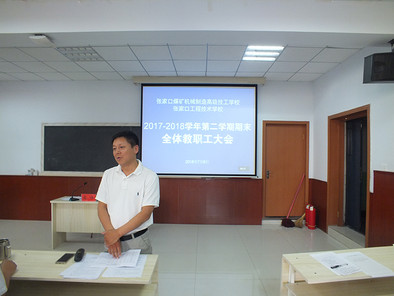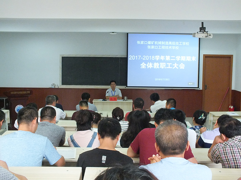 2018年7月8日,張家口煤礦機械制造高級技工學校在綜合樓階梯教室召開了2017-2018學年第二學期期末全體教職工大會,會議由黨委委員、副校長張樹偉同志主持。