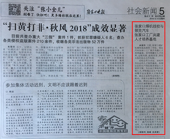 張家口日報(bào)對我校與領(lǐng)克汽車張家口工廠校企合作、共建人才培養(yǎng)基地進(jìn)行報(bào)道