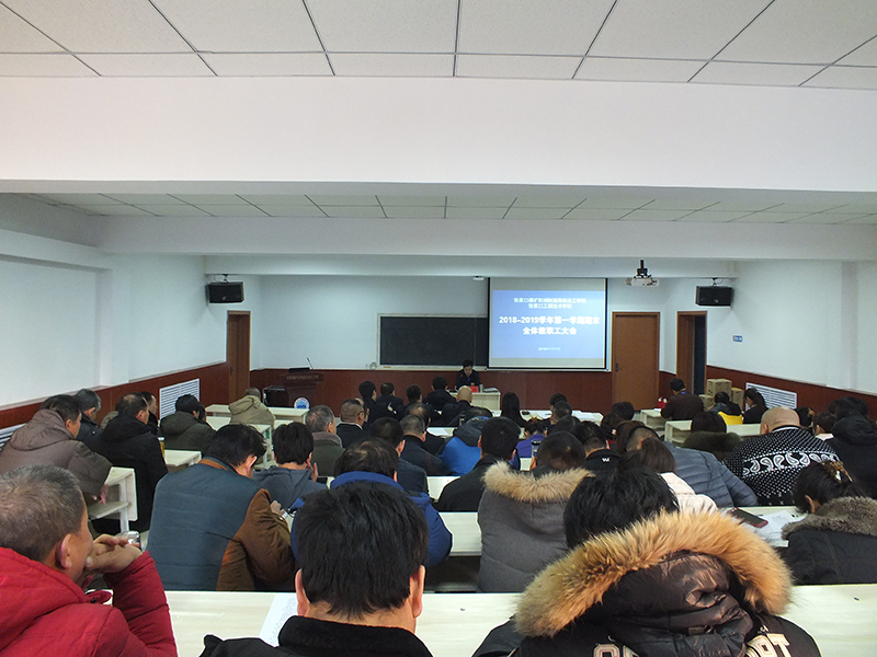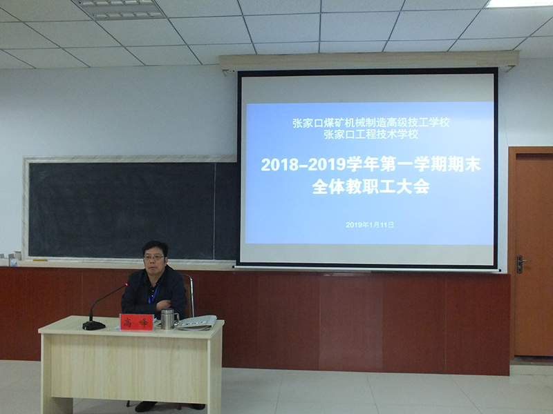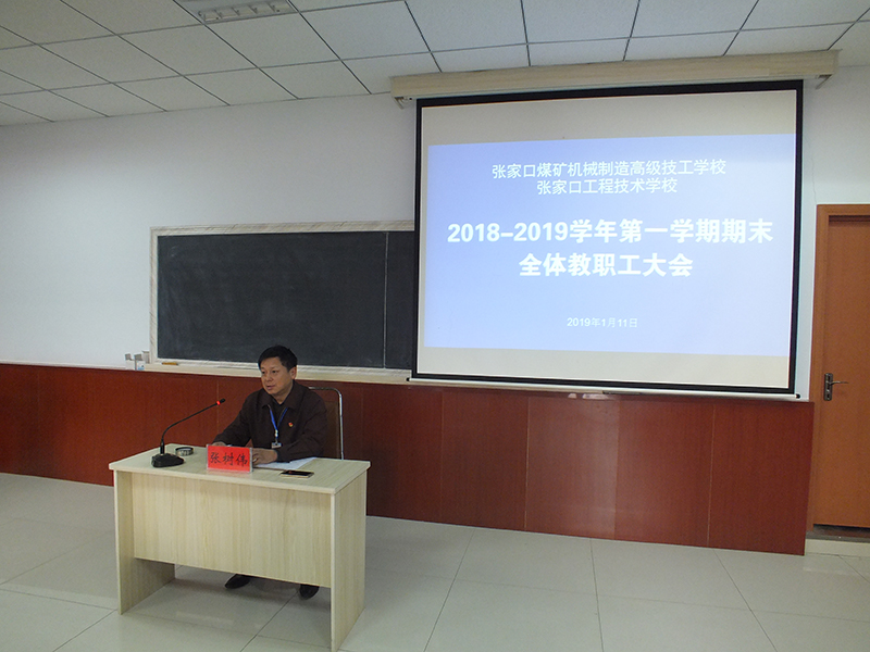 2019年1月11日,張家口煤礦機械制造高級技工學校在綜合樓階梯教室召開了2018-2019學年第一學期期末教職工大會。黨委副書記、校長高峰同志作了講話,黨委委員、副校長張樹偉同志主持會議,全體教職工參加了大會。